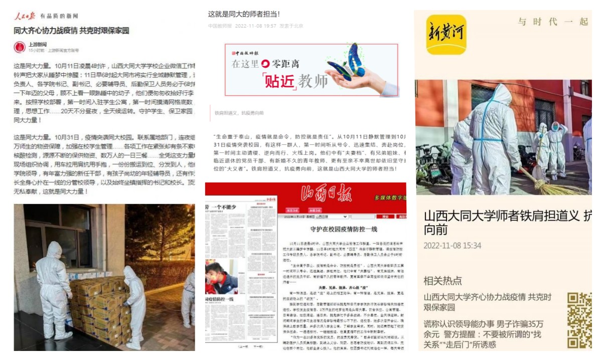 10月31日,疫情突襲同大校園。黨委宣傳部在新媒體矩陣平臺上陸續(xù)推出“這就是同大力量、這就是同大的師者擔當、這就是同大的青年擔當、這就是同大的醫(yī)者守護、這就是同大的堅強后盾”系列報道(先后被人民日報、人民網、中國教師報、鳳凰新聞、網易新聞、上游新聞、山西日報、大同廣播電視臺、新黃河等國家級和省市媒體轉載報道),“抗疫人物風采展示”系列報道,攜手音樂學院、文學院等制作原創(chuàng)抗疫歌曲《我們一起來》《逆行者之歌》《同心同向》,推出抗疫視頻《你的答案》《平凡天使》《窗前》等,對我校的抗疫工作進行了全方位、多角度的報道,全面展示了全體師生醫(yī)護員工在校黨委的堅強領導下,始終同仇敵愾、攜手并肩、團結一心抗擊疫情的堅定決心,充分展現(xiàn)了同大人的精氣神,體現(xiàn)了無愧于初心使命、無愧于育人責任的同大擔當。