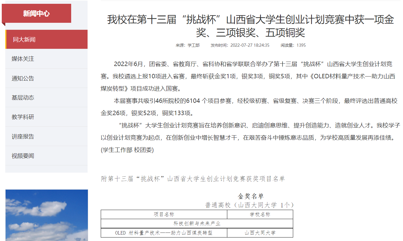 6月,團省委、省教育廳、省科協(xié)和省學聯(lián)聯(lián)合舉辦了第十三屆“挑戰(zhàn)杯”山西省大學生創(chuàng)業(yè)計劃競賽。我校斬獲金獎1項,銀獎3項,銅獎5項。