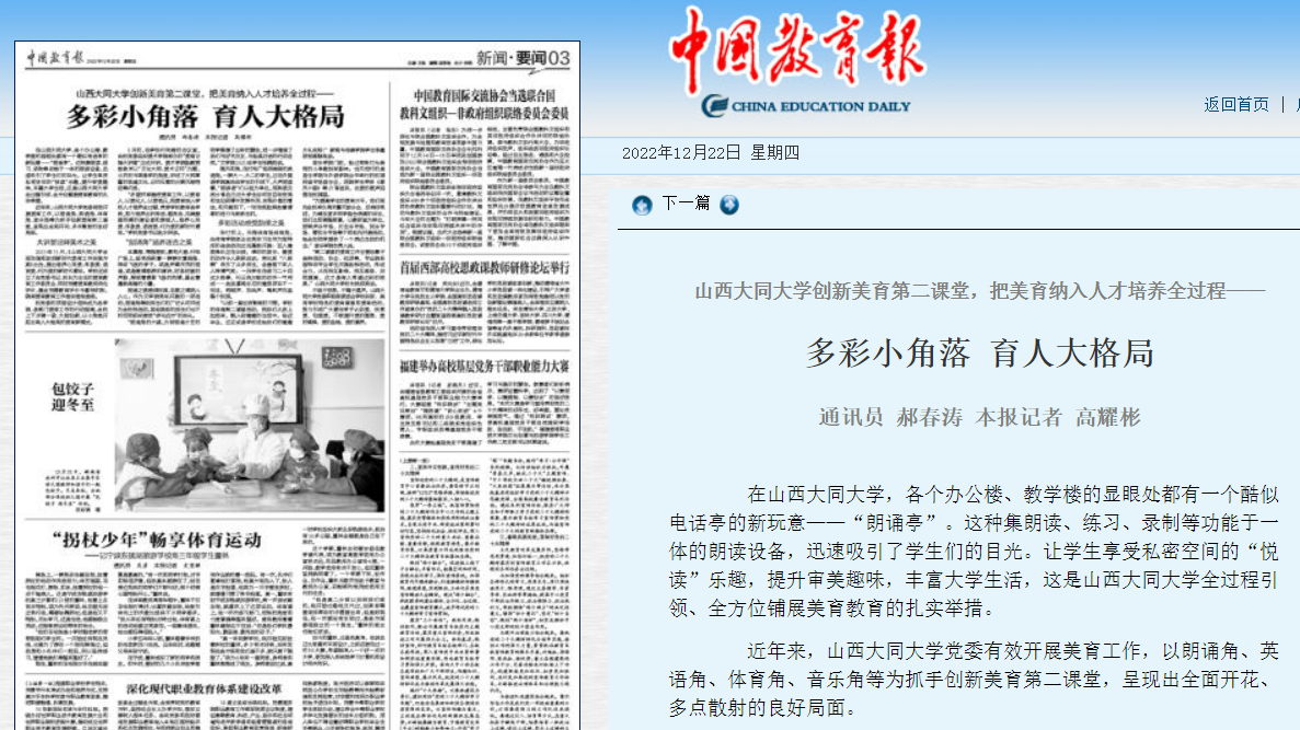 12月22日,《中國教育報》在第三版頭條位置,以《多彩小角落育人大格局》為題,報道了我校全過程引領、全方位鋪展美育教育的扎實舉措。