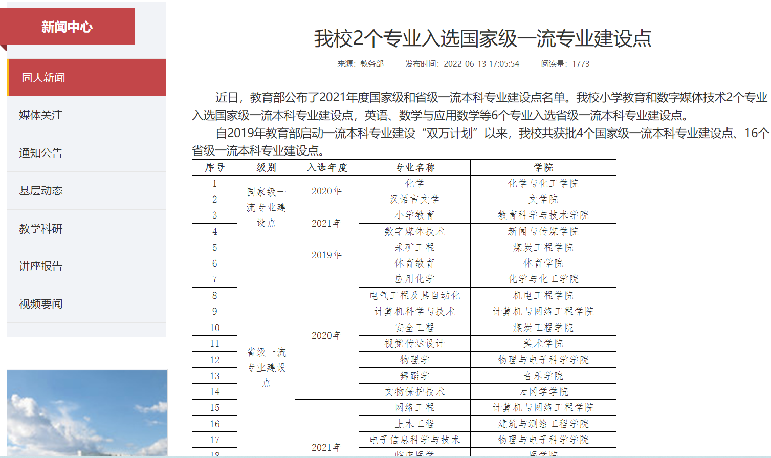 6月,教育部公布2021年度國家級和省級一流本科專業(yè)建設點名單。我校小學教育和數(shù)字媒體技術2個專業(yè)入選國家級一流本科專業(yè)建設點,英語、數(shù)學與應用數(shù)學等6個專業(yè)入選省級一流本科專業(yè)建設點。