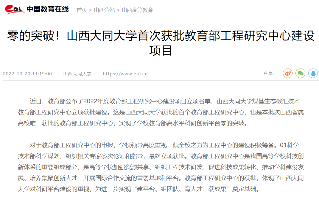 10月,教育部公布了2022年度教育部工程研究中心建設項目立項名單,山西大同大學煤基生態(tài)碳匯技術教育部工程研究中心立項獲批建設。這是我校獲批的首個教育部工程研究中心,也是本批次山西省屬高校唯一獲批的教育部工程研究中心,實現(xiàn)了學校教育部高水平科研創(chuàng)新平臺零的突破。