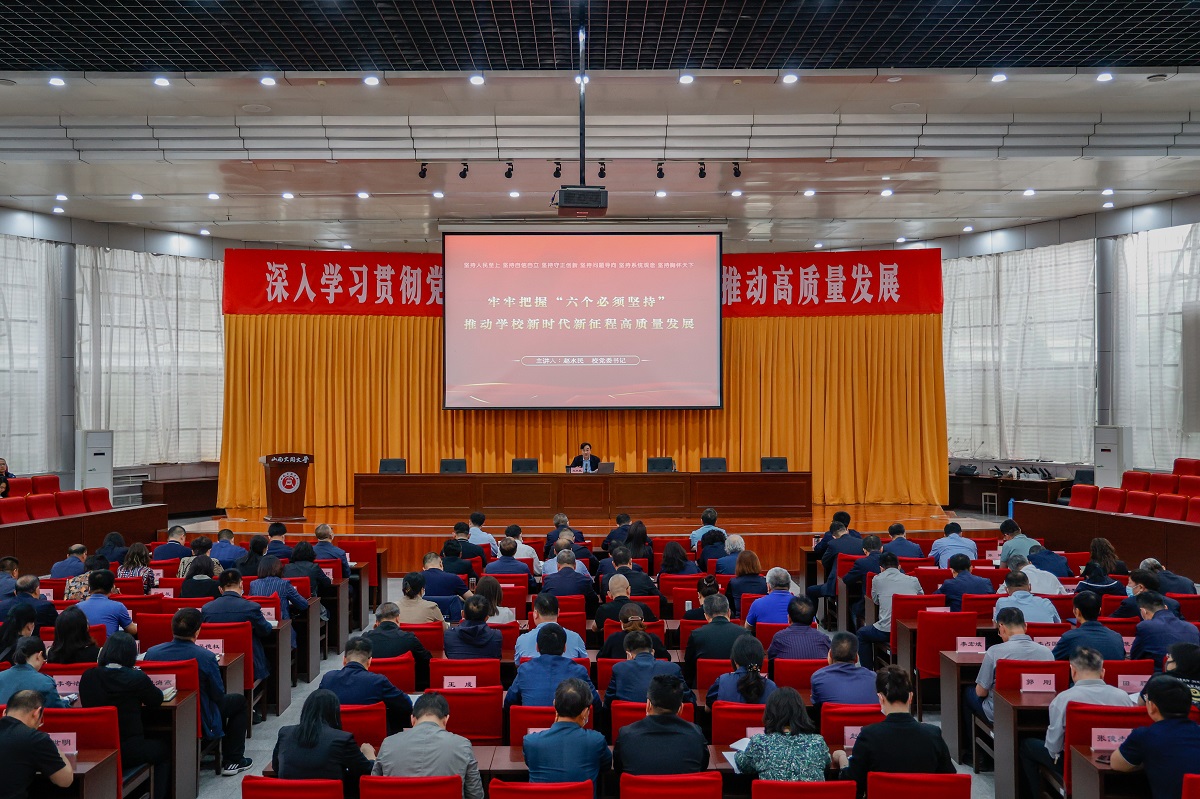 ?? 按照學校黨委關于主題教育的部署安排,5月29日下午,校黨委書記趙水民以《牢牢把握“六個必須堅持”推動學校新時代新征程高質量發展》為題,帶頭講授主題教育專題黨課。省委主題教育第二十四巡回指導組李志忠同志、張健同志蒞臨指導。學校領導班子成員、科級以上干部參加黨課學習。黨課由校黨委副書記寇福明主持。