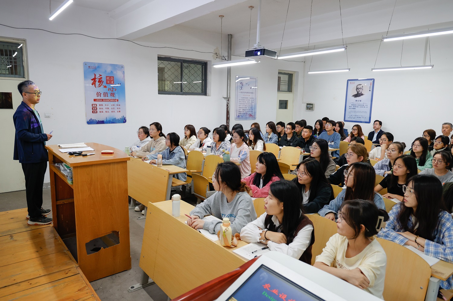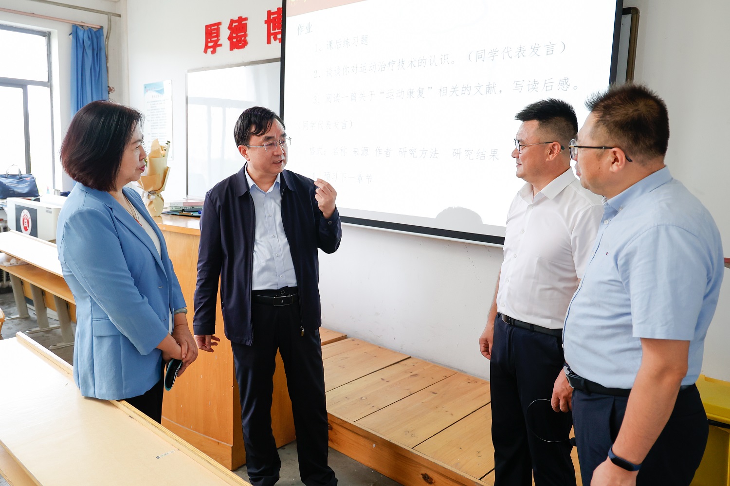 上午8點,趙水民來到博雅樓,分別與2021級設施農業科學與工程一班、2021級運動康復一班的同學們共同聆聽了韓志平老師主講的《農業設施設計與建造》課程、王海老師主講的《運動康復治療技術》課程。課后,趙水民與任課教師進行交流,對課堂效果給予肯定,并詢問了解他們的教學、科研工作情況。他指出,教學的主陣地在課堂,提高課堂教學質量的關鍵在教師,要不斷更新教育理念,精心設計課程計劃,著力改進課堂教學方式方法,充分調動學生參與課堂教學的積極性,在教與學的互動中實現教學目的。在狠抓課堂教學的同時,要結合省情、市情、校情和學生實際加強實踐教學,讓學生們走進田間地頭、廠礦企業、街頭巷尾,在廣闊的天地中進行豐富的實踐學習,持續擦亮學校人才培養的應用型底色。