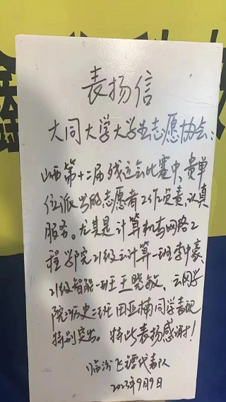 “殘健共融、天下大同”。9月9日,山西省第十二屆殘疾人運動會在大同市落下帷幕。我校青年志愿者收到了來自太原田徑代表隊、長治市代表隊、臨汾飛鏢代表隊、殘疾人運動員等的表揚信,他們對運動會期間參與志愿服務450名青年志愿者的不辭辛苦、傾情奉獻、全力服務給予了高度肯定和贊揚。青年志愿者們用實際行動傳遞著關愛與溫暖,保質保量完成了各類志愿服務工作,為省殘運會的順利舉辦提供了強有力的支持。