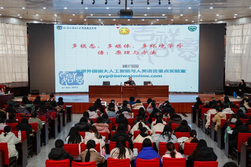 顧曰國教授作了題為《多模態(tài)、多媒體、多環(huán)境學(xué)外語:原理與方法》的學(xué)術(shù)講座。顧曰國教授聚焦學(xué)習(xí)本質(zhì),系統(tǒng)講授了自然多模態(tài)學(xué)習(xí)中的動因律、內(nèi)化律、不可替代律、過程律、丟失律和實踐律六大定律,以及多模態(tài)、多媒體、多環(huán)境“三多”學(xué)習(xí)外語的策略與風(fēng)格。