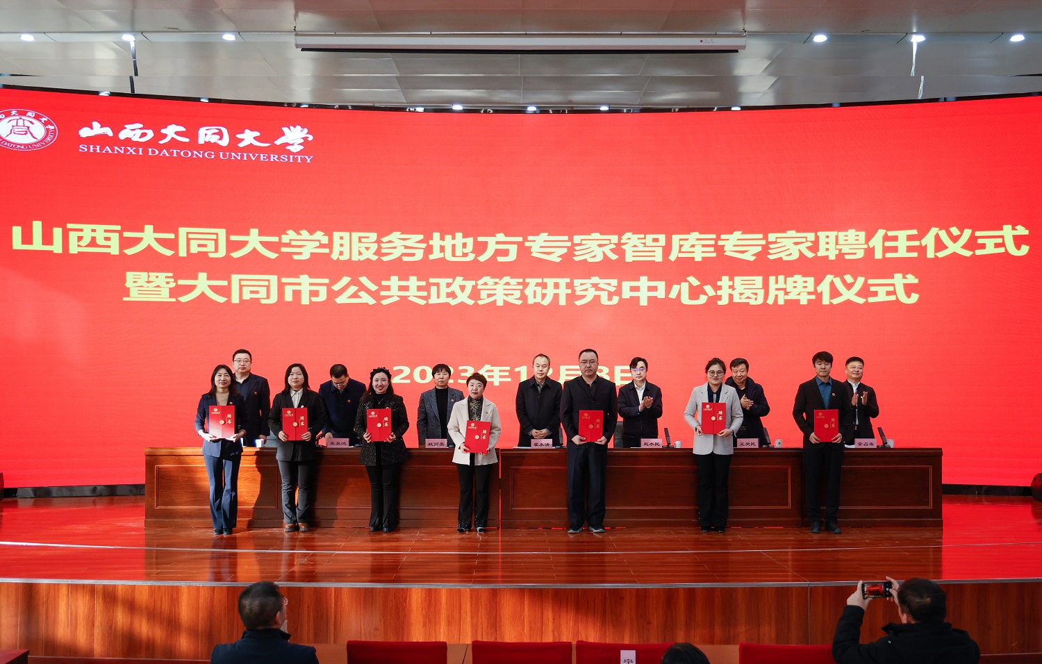12月8日,山西大同大學服務地方專家智庫專家聘任儀式暨大同市公共政策研究中心揭牌儀式在我校慎思樓報告廳舉行。校黨委書記趙水民,校黨委副書記、校長姚麗英,大同市政府黨組成員、副市長翟永清,大同市政府發展研究中心主任王愛民,學校發展規劃合作部部長張健,中共大同市委政策研究室副主任常占庫出席儀式。校黨委常委、副校長史水鴻主持儀式。