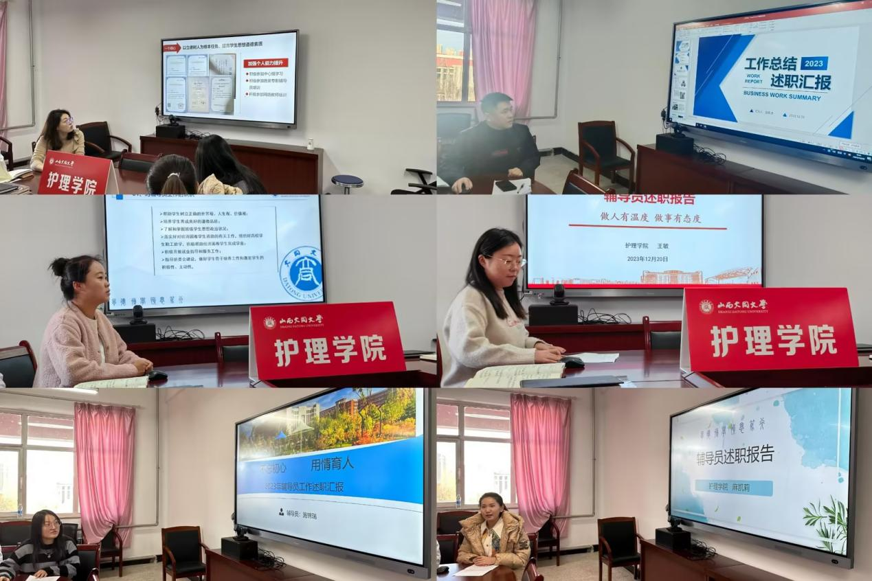 護理學院共有6位專職輔導員,老師們依次從自己的崗位出發,從工作開展、特色成效、未來展望等方面,將一年工作的內容,取得的成績以及對未來的規劃展開匯報。特別對2023年所負責的學生管理和分管的思想政治教育、學生日常管理、黨團建設、學風建設、就業指導等工作進行了全面、詳實的述職匯報。