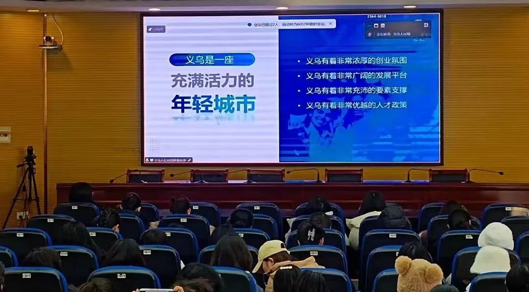 活動開始,義烏市人力資源和社會保障局首先通過屏幕對畢業生們宣講義烏市基本情況和就業環境,并向大家介紹了大學生實習補貼、大學生生活補貼、高校畢業生就業補貼等就業人才政策。