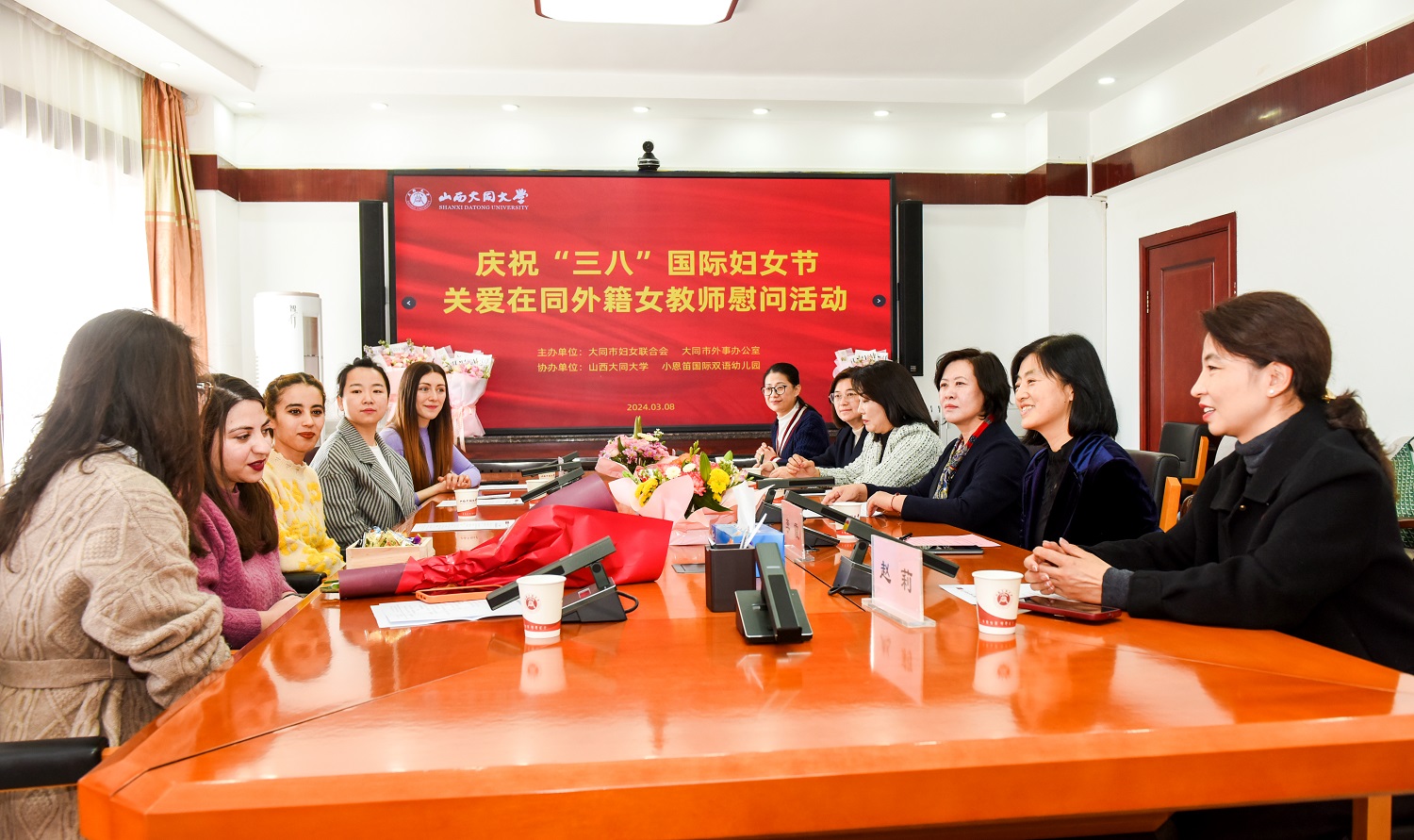 ? 3月8日,在第114個“三八”國際勞動婦女節來臨之際,為深入貫徹“大拜訪、大調研、大合作”工作要求,國際交流中心聯合市婦聯、市外事辦舉辦關愛在同外籍女教師慰問活動。大同市婦聯黨組書記、主席張學梅,大同市外事辦主任李霞,校工會主席候桂蘭,國際交流中心副主任趙莉等出席會議。我校俄羅斯籍女教師AikuiMkrtchian與小恩笛國際雙語幼兒園摩洛哥籍外教Asmae(阿蘇美)、亞美尼亞籍外教TamaraMeliksetyan(塔瑪拉)作為外籍教師代表參加活動。