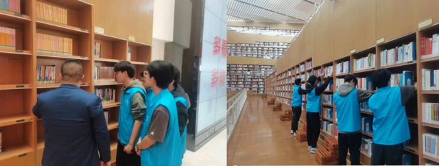 在志愿活動中,通過工作人員的細心講解,志愿者們充分了解到如何在館內自助辦理閱覽卡和借閱卡,以及如何查找、借閱、歸還館內圖書等工作內容。隨后,志愿者們分成多個小組奔赴各自的“工作崗位”,在圖書館老師的帶領下對書架上的書籍進行分類匯總,對“書墻”進行清掃整理等工作。工作認真高效、井井有條,充滿熱情,獲得圖書館負責人的肯定與贊揚。