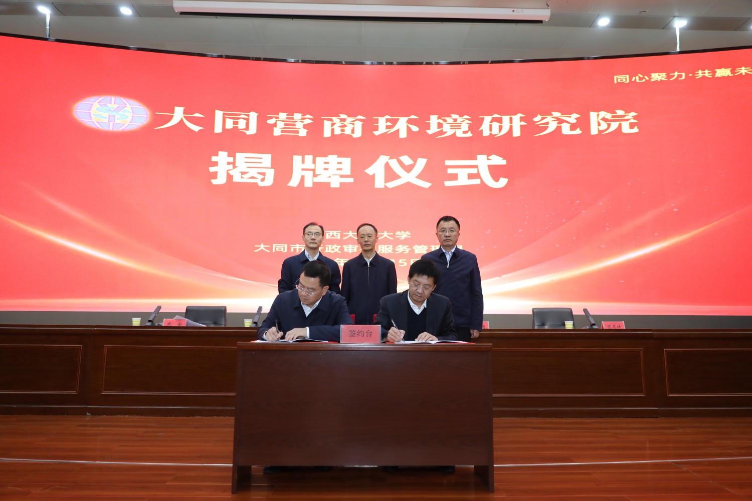 史水鴻、陳月祥代表雙方簽訂《山西大同大學(xué) 大同市行政審批服務(wù)管理局合作共建“大同營商環(huán)境研究院”協(xié)議書》。