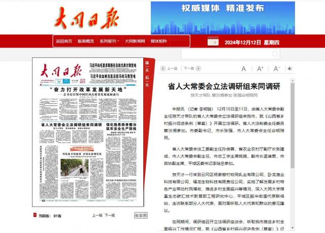 在同期間,調研組召開立法調研座談會,聽取我市推進鄉村全面振興工作情況匯報,就《山西省鄉村振興促進條例(草案)》征求相關部門、企業、鄉鎮和部分人大代表的意見建議。賀天才指出,鄉村振興戰略是關系全面建設社會主義現代化國家的全局性、歷史性任務。各級各有關部門要深入學習貫徹黨的二十屆三中全會精神和習近平總書記關于“三農”工作的重要論述,堅決貫徹落實黨中央和省委部署要求,把推進鄉村全面振興作為新時代新征程“三農”工作的總抓手,以學習運用“千萬工程”經驗為引領,扎實推進鄉村產業發展、鄉村建設、鄉村治理等重點任務,加快推進農業農村現代化。要堅持以良法促發展保善治,把以人民為中心的發展思想貫穿立法工作始終,深入了解制約鄉村振興發展的瓶頸短板和群眾急難愁盼問題,廣泛聽取、認真研究人民群眾提出的意見建議,切實增強立法的針對性、適用性和可操作性,注重宣傳引導,狠抓舉措落實,充分發揮《條例》在鄉村振興中的引領、保障和推動作用。