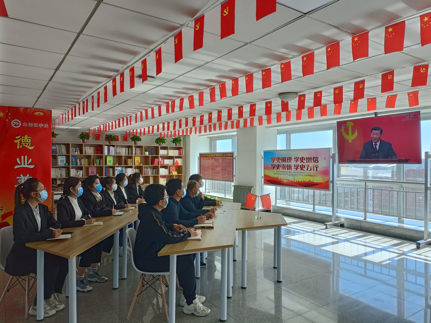 ?????? 10月23日,中國共產(chǎn)黨第二十屆中央委員會第一次全體會議新選出的中央政治局常委同采訪中共二十大的中外記者見面。見面會上,習(xí)近平總書記發(fā)表重要講話。我校校院兩級黨委理論學(xué)習(xí)中心組和各學(xué)院、部門、黨支部采取集中和分散相結(jié)合的方式,認(rèn)真組織黨員干部和師生員工收看見面會直播盛況,深入學(xué)習(xí)習(xí)近平總書記重要講話,進(jìn)一步在全校范圍內(nèi)掀起學(xué)習(xí)貫徹黨的二十大精神的高潮。