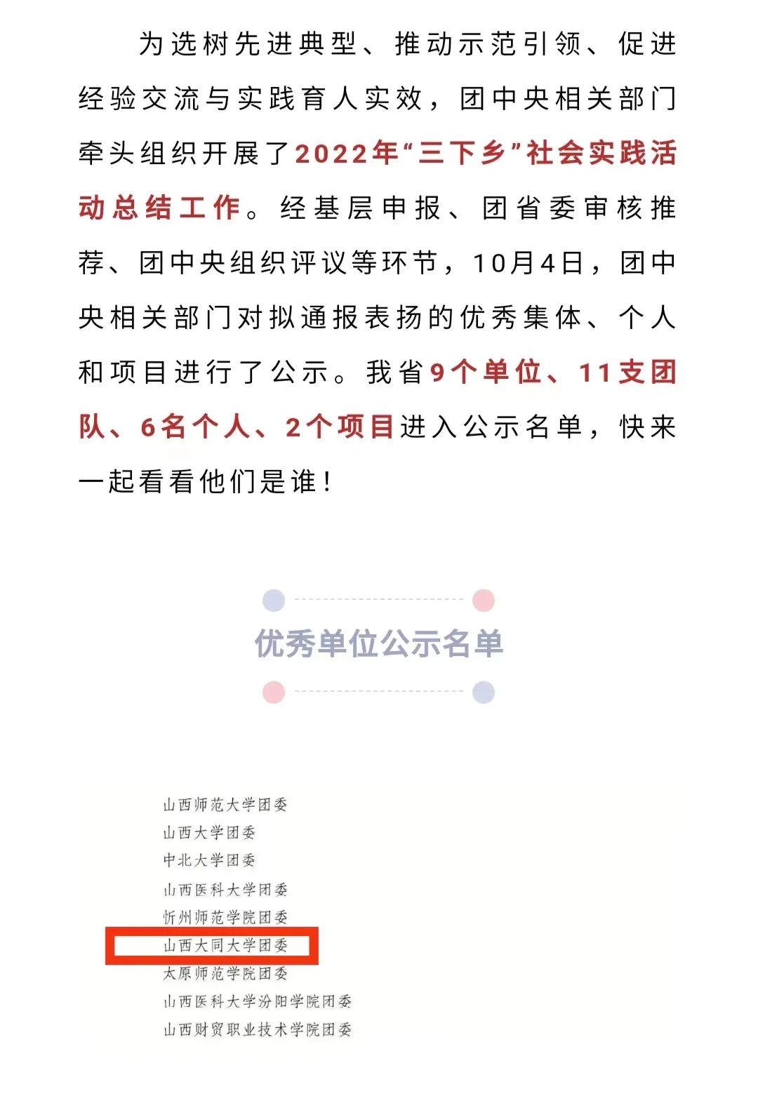 經基層申報、團省委審核推薦、團中央組織評議等環節,10月21日,團中央相關部門對“三下鄉”社會實踐優秀集體、個人和項目進行通報表揚。我省16個單位、30支團隊、36名個人進入通報表揚名單,我校名列其中,榮獲2022年全國“三下鄉”社會實踐優秀單位和山西省“三下鄉”社會實踐優秀單位。