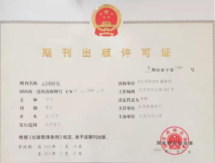 2020年5月,習近平總書記考察了云岡石窟,并作出重要指示:“云岡石窟是世界文化遺產,保護好云岡石窟,不僅具有中國意義,而且具有世界意義”,“要深入挖掘云岡石窟蘊含的各民族交往交流交融的歷史內涵,增強中華民族共同體意識”,“切實加大文物保護力度,推進文物合理適度利用,使文物保護成果更多惠及人民群眾”。習近平總書記對云岡石窟的重要指示,為我校的云岡研究指明了方向,也極大地堅定了全校上下把云岡研究推上新臺階的信心和干勁。2020年9月9日,山西大同大學云岡學學院和云岡文化生態研究院揭牌;2020年11月18日,《云岡研究》(季刊)獲國家新聞出版署批準出版。至此我校圍繞云岡學建設,形成了“兩院一刊一欄”的格局。