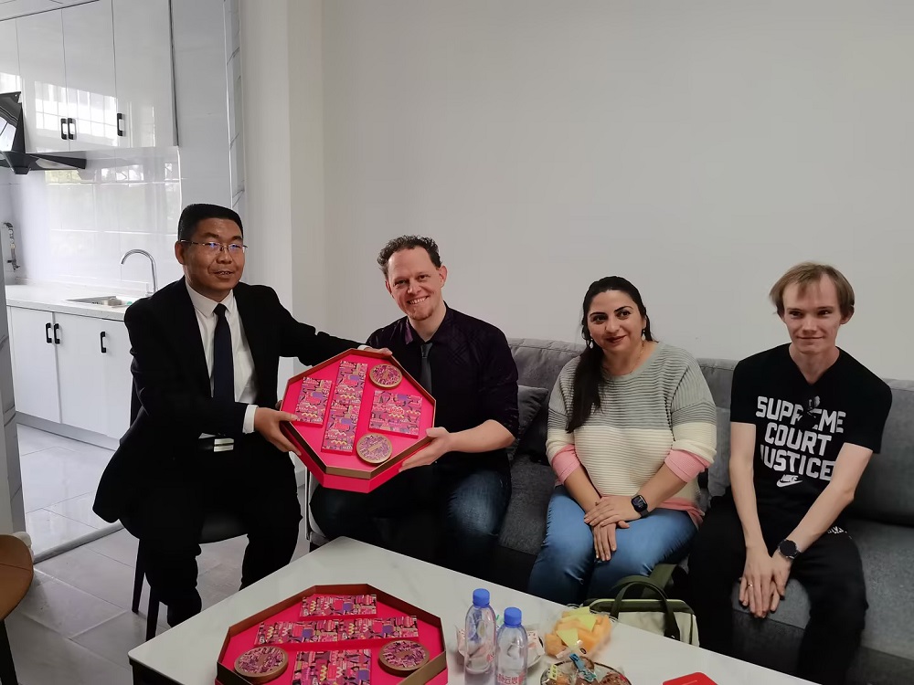 月滿人團圓,家國共此時。值此中秋節、國慶節“雙節”來臨之際,9月28日上午,校黨委常委、副校長雷建設走訪了我校在同外籍教師,向他們表示節日的慰問。國際交流中心全體人員參加活動。
