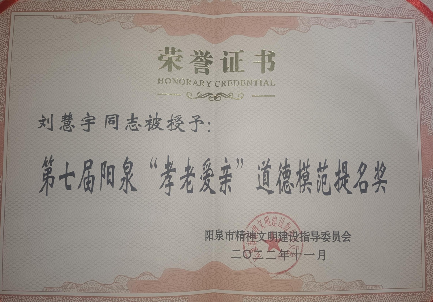 2022年,憑借著自身努力,劉慧宇順利通過(guò)了專(zhuān)升本考試,成為一名同大學(xué)子。到外地求學(xué),遠(yuǎn)在陽(yáng)泉的母親是劉慧宇最為牽掛的,最初她想把母親帶到身邊,但由于疫情等原因未能成行,只能由妹妹代為照顧母親。然而好景不長(zhǎng),痼疾纏身的母親又因膽結(jié)石手術(shù)、低血糖、股骨骨折等多次住院,心急如焚的劉慧宇只能請(qǐng)假返鄉(xiāng),衣不解帶地日夜守護(hù)在母親病床邊。生活的重?fù)?dān)沒(méi)有將她壓垮,反而讓她愈挫愈勇,在同大求學(xué)期間,先后獲得校級(jí)獎(jiǎng)學(xué)金、第七屆陽(yáng)泉孝老愛(ài)親道德模范提名獎(jiǎng)、陽(yáng)泉市第一屆城區(qū)孝老愛(ài)親道德模范提名獎(jiǎng)。劉慧宇用樂(lè)觀與堅(jiān)強(qiáng),成為了好學(xué)生、好姐姐,更是母親最貼心的“小棉襖”。