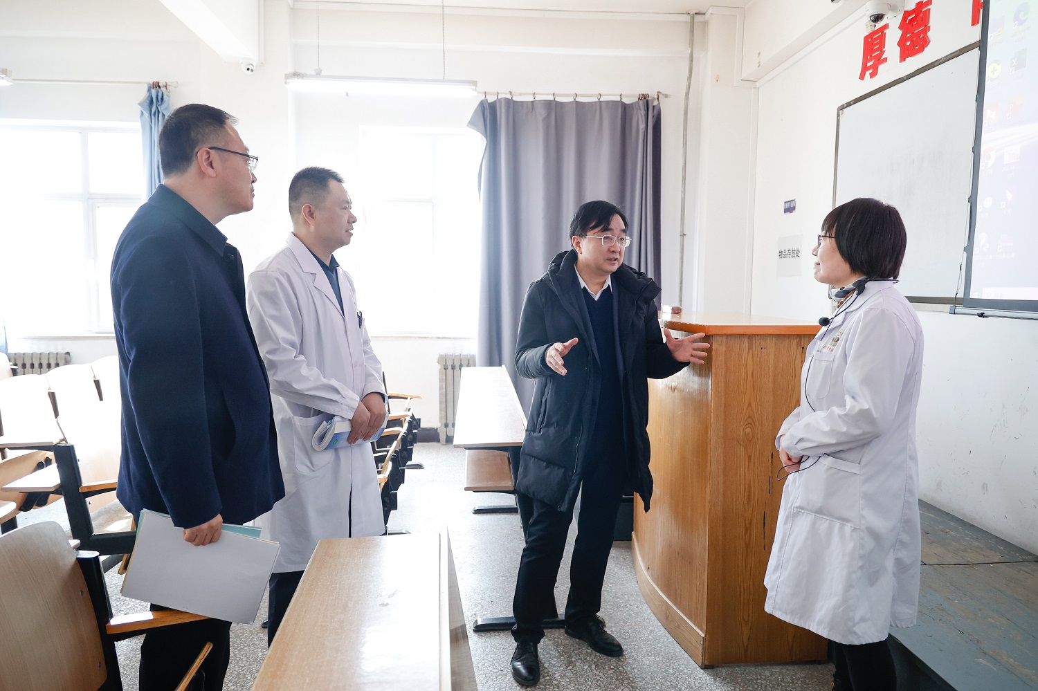 7時30分許,校黨委書記趙水民早早來到行知樓,迎接前來上課的師生,分別與2023級思政二班、2023級中醫二班的同學們共同聆聽了郭蕓老師主講的《邏輯學》課程、楊霞老師主講的《中醫診斷學》課程。課后,趙水民與任課教師進行交流,對課堂效果給予肯定,并詢問了解他們的教學、科研工作情況。他強調,教學質量是學校工作的生命線,教學的主陣地在課堂,要緊緊圍繞課程設計下苦功、細功、實功,打造更多“金課”,著力探索創新教學方式方法,做到寓教于樂、融學于趣、化教于心,進一步調動學生參與課堂教學的積極性,實現以學促教、教學相長。要兼顧課堂教學與實踐教學,充分發揮實踐育人作用,讓我們培養出來的學生既有扎實的理論功底,又有過硬的實操能力,持續擦亮人才培養的應用型底色。
