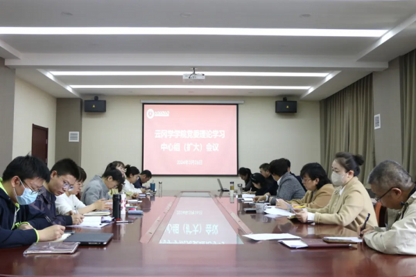 ? 3月26日下午,云岡學學院黨委在文德樓四層會議室召開2024年第三次理論學習中心組(擴大)會議。學院領導班子、科級以上干部、系主任、各黨支部書記、專職組織員、輔導員參加本次學習,會議由學院黨委書記解廷月主持。
