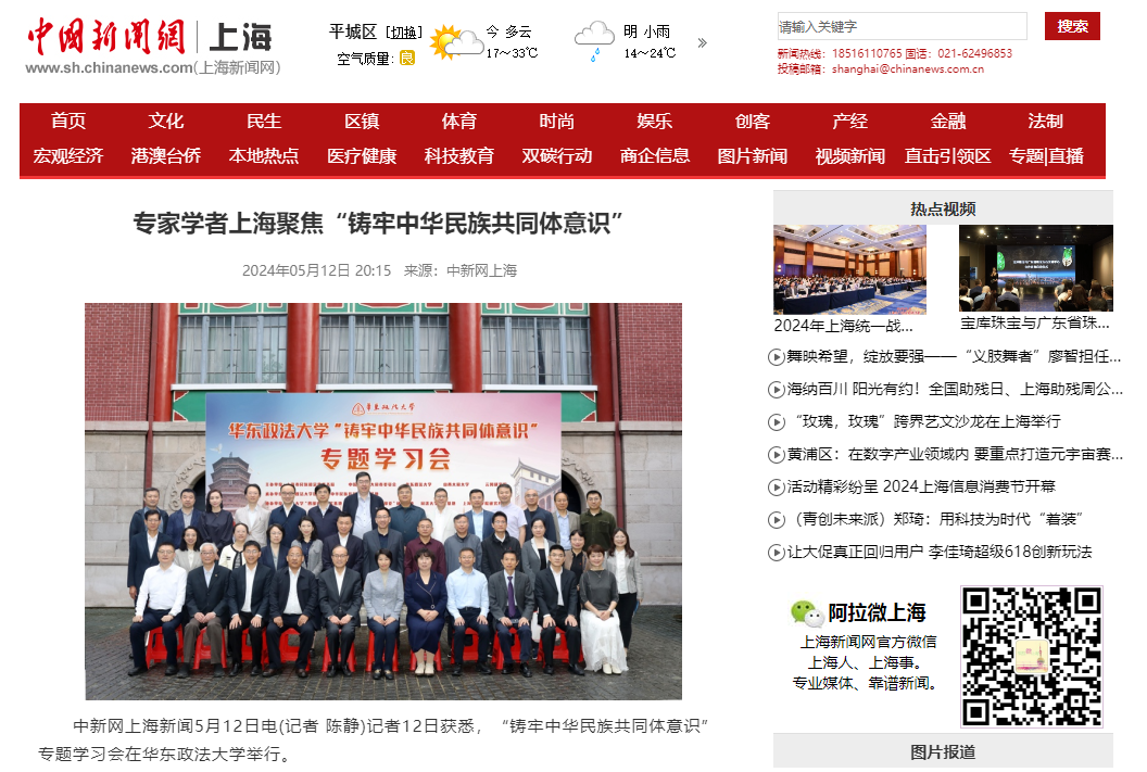 5月11日,由上海市民族和宗教事務局、中國共產黨大同市委員會、華東政法大學、山西大同大學、云岡研究院共同主辦的“鑄牢中華民族共同體意識”專題學習會在華東政法大學舉行,中國新聞網、中國社會科學網、上海市人民政府官網、上海法治報對此進行了報道。校黨委副書記、校長姚麗英在會上致開幕詞,著重介紹了我校在加強研究體系構建、發揮智庫作用、打造文化宣傳品牌及深入開展學習調研實踐等方面的有益嘗試和成果。