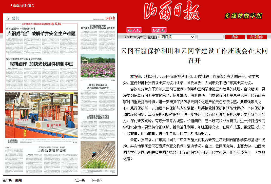 5月12日,山西日報的報道《【沿著總書記的足跡】云岡石窟:千年瑰寶綻放時代光華》中提到,“云岡研究院聯合山西大學、山西大同大學,積極推進中宣部‘平城與北魏絲綢之路與民族融合的科技考古研究’重大基礎研究項目。”
