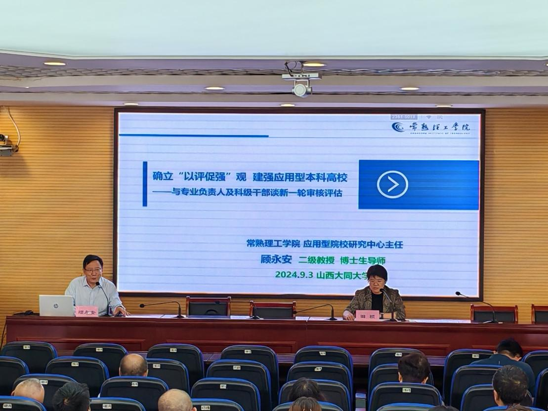 為做好本科教育教學(xué)審核評估工作,主動適應(yīng)高等教育應(yīng)用型轉(zhuǎn)型發(fā)展需求,著力引導(dǎo)本科教育改革和高質(zhì)量發(fā)展,9月3日,我校邀請教育部本科教育教學(xué)審核評估專家、教育部學(xué)校規(guī)劃建設(shè)發(fā)展中心專家、常熟理工學(xué)院應(yīng)用型院校研究中心主任、博士生導(dǎo)師顧永安教授作專題培訓(xùn)報告。全校科級干部、專業(yè)負(fù)責(zé)人參加會議。會議由教學(xué)質(zhì)量監(jiān)控與督導(dǎo)中心主任田穎主持。