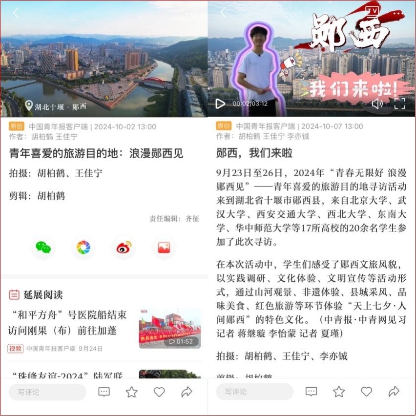 近日,我校新聞與傳媒學院胡柏鶴、丁浩宇同學分別參加了中國青年報社“青年喜愛的旅游目的地”系列活動“青春無限好浪漫鄖西見”尋訪活動、“2024青春祁遇記——大學生走進祁門”活動,實踐成果刊發在《中國青年報》版面、《中國青年報》客戶端等央媒平臺,在文旅實踐活動中發出了同大青年聲音。中國青年報社“青年喜愛的旅游目的地”尋訪活動,旨在鼓勵和引導高校大學生讀萬卷書,行萬里路,于行走中感悟中華文化,在山河間認識新時代的中國。