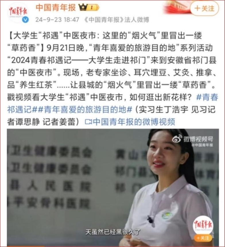 ?丁浩宇制作的中醫夜市主題視頻在《中國青年報》官方微博發布