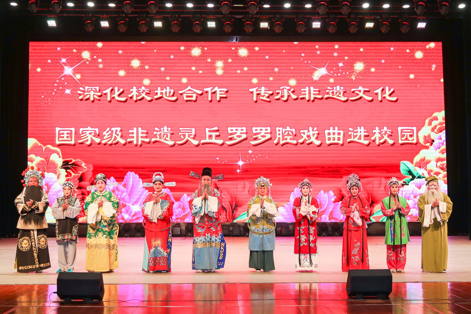 10月31日,靈丘縣羅羅腔劇種傳習以“深化校地合作傳承非遺文化”為主題的演出活動走進我校,為師生們帶來了一場精彩絕倫的文化視聽盛宴。校黨委副書記、校長姚麗英,校黨委常委、副校長史水鴻,及我校800余師生觀看演出。