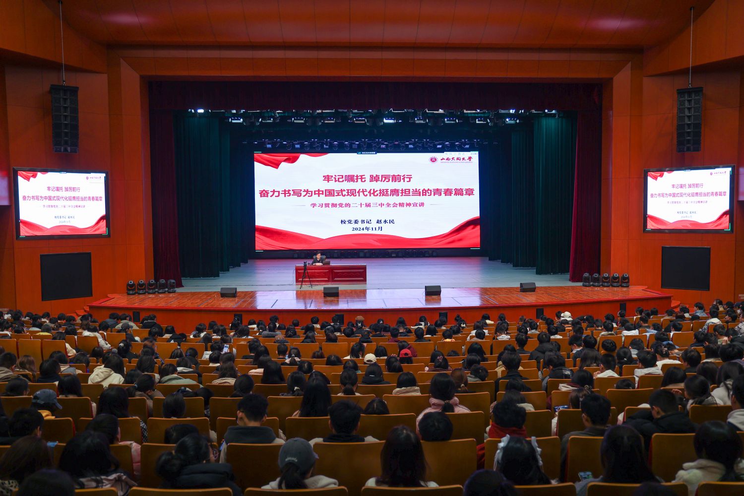 趙水民圍繞“深入學習領會習近平總書記在黨的二十屆三中全會上的重要講話精神”“黨的二十屆三中全會的亮點”“堅定踐行全過程人民民主”“青春為中國式現代化挺膺擔當”,介紹和解讀黨的二十屆三中全會精神,勉勵同學們在新的歷史起點上,開闊人生格局、錘煉過硬本領、做好未來規劃,奮力書寫為中國式現代化挺膺擔當的青春篇章。