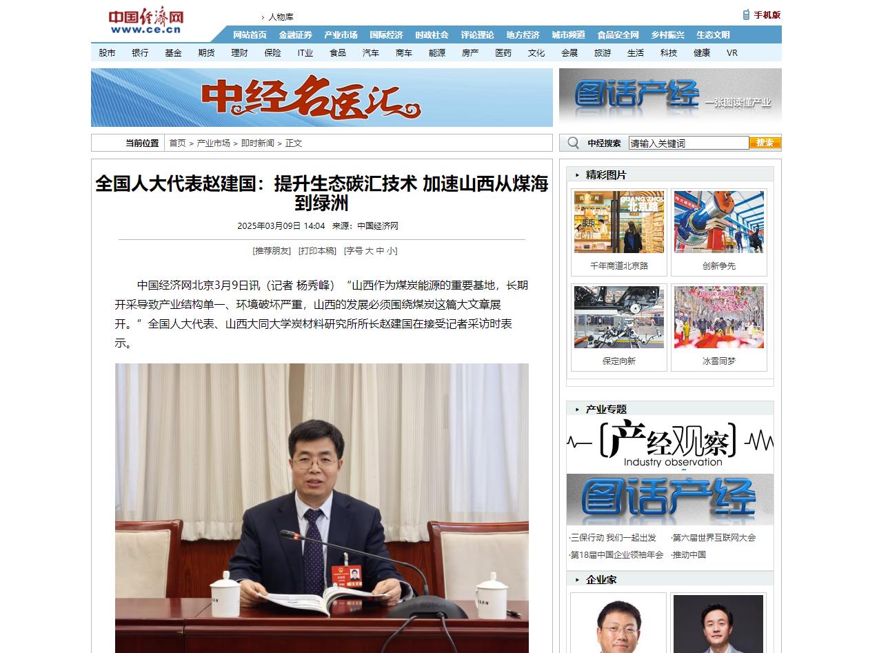 3月9日,中國經濟網《全國人大代表趙建國:提升生態碳匯技術加速山西從煤海到綠洲》的專題報道中寫道:近年來,山西大同大學圍繞國家“雙碳”目標,在煤基新材料制備及其在生態碳匯應用領域積累了深厚的研究基礎,建立了“石墨烯林業應用國家林草局重點實驗室”和“煤基生態碳匯技術教育部工程研究中心”。鹽堿地治理、沙漠化土地綠化以及礦山生態修復等成為生態碳匯領域的研究攻關主要研究方向。趙建國建議,整合山西本土科研基礎,籌建生態碳匯國家重點實驗室,助力山西實現由“煤老大”向“能源革命排頭兵”的轉變,推動生態碳匯技術高質量發展迫在眉睫。